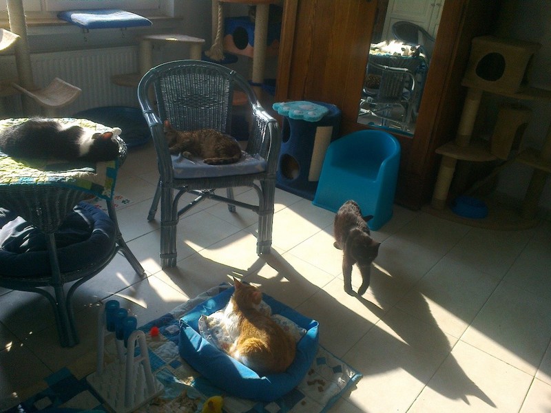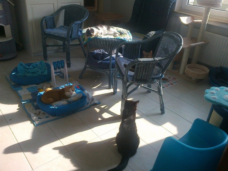 Gemeldet wurde uns im November 2013 ein Notfall aus Rösrath. Eine ältere Dame, abgeschieden und allein wohnend, war verstorben, der selbst unter Betreuung stehende Herr Sohn warf alle 23 Katzen der verstorbenen Mutter raus aus dem Haus. Eine private Tierschützerin erhielt hiervon Kenntnis und bat uns um Beratung und Mithilfe, was man hier tun könne. Es bot sich uns bei einem ersten „Besichtigungstermin“ der Örtlichkeiten und der Katzen ein Bild des Grauens :-((( Im Nieselregen, wie die Hühner auf einer Stange, auf einer den Witterungen ausgesetzten alten zerfledderten Couch nebst schimmeligen Sessel hockte eine Traube von Katzen, die verzweifelt versuchten, sich gegenseitig zu wärmen. Kaum eine wog noch mehr als zwei Kilo, wie sich später herausstellen sollte. Die ältere Dame hat die Tiere wohl schon Monate nicht mehr versorgen können und der Rauswurf in die Nässe und Kälte ohne Futter hat dann das Maß zum Überlaufen gebracht… Verzweifelte Augenpaare richteten sich auf uns, bei mehreren Katzen sah man eigentlich nur noch ein Auge, das andere war zerstört :-( Knochendürre Gestalten, alle älteren Datums, überall vereiterte Gesichtchen und herausstehende Knochen. Hier musste schnell gehandelt werden, um zu retten, was noch ging. Das von uns zunächst notdürftig und unter eigenen Tränen verteilte Futter wurde unter großem Gezanke und Gekreische versucht zu ergattern, wir schütteten Dosen sogar einfach auf den Boden, damit alle sich was greifen konnten ohne sich zu zerfetzen. In solchen Momenten ist Tierschutz eine noch schwerere Bürde als sonst, wohin mit all den hungrigen kranken Katzen? Keine davon kastriert .... Und solche Katzen will ja kaum jemand adoptieren....