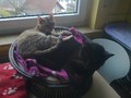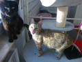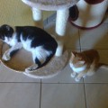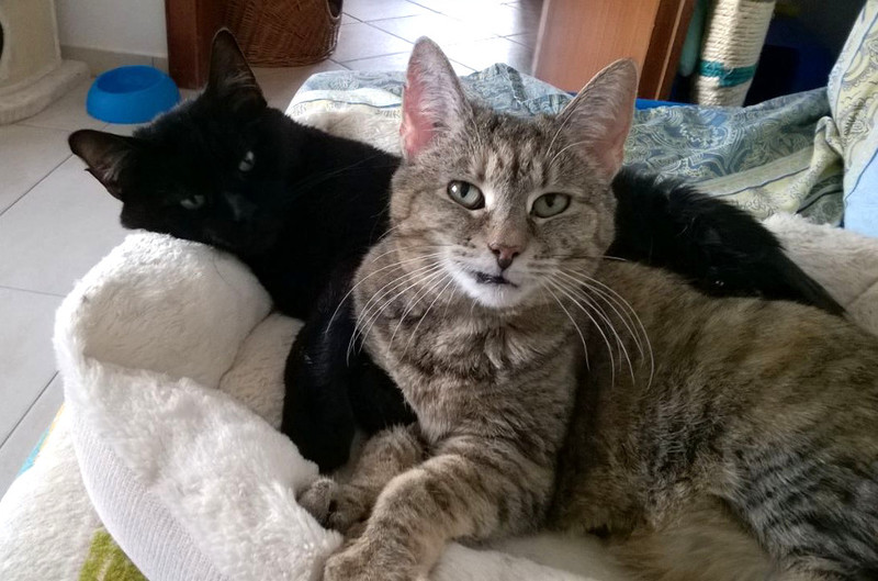 Die schwarze Felicitas (10-12 Jahre) ist scheinbar Speedys Mutter, jedenfalls verhält sich Speedy (8-10 Jahre) so. Sie schmiegt sich im Vorbeigehen immer bei Felicitas an und piepst mit kleinem Stimmchen. Felicitas putzt ihr dann übers Köpfchen. Diese beiden Katzendamen möchten wir nicht mehr trennen, sie haben so viel hinter sich und sollen künftig die Zeit gemeinsam und in Ruhe verbringen dürfen. Felicitas kann sich gut durchsetzen, das musste sie wohl auch lernen, ist aber grundsätzlich sehr verträglich. Sie ist vom Wesen her sehr ruhig und bescheiden, könnte stundenlang geschmust werden, schmiegt sich eng an einen und schnurrt vor sich hin, lässt sich bürsten und folgt einem gern, um zu sehen, ob nicht doch noch eine Streicheleinheit für sie abfällt. Futtern tut sie auch gern ;-) Speedy ist noch manchmal sehr verspielt und etwas lebhafter als Felicitas, dafür aber nicht so schmusig. Dabei ist sie aber immer. Und wenn es Stängelchen gibt, dann gibt es kein Halten :-) Felicitas hat innen verwachsene Ohren, die sie allein nicht sauberhalten kann. Einmal die Woche sollte man was zum Reinigen eintröpfeln und etwas saubermachen. Bei Speedy hat sich anfangs das Mäulchen immer mal entzündet, das ist aber jetzt schon lange her. Aber vielleicht könnte es mal wiederkommen, bei Stress, dann braucht sie eine Spritze. Beiden würde ein gesicherter Balkon reichen, Freigang in guter ruhiger Gegend darf natürlich auch sein. Die beiden kommen ja aus einer großen Gruppe und könnten auch gern zu einem gemütlichen ruhigen Kater hinzuvermittelt werden. Beide sind kastriert, negativ auf FIV und FeLV getestet, entwurmt, entfloht, mit einem Microchip gekennzeichnet und können gern auf ihrer Pflegestelle im Bergischen Land besucht werden.