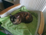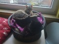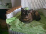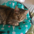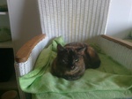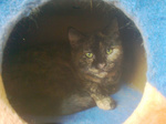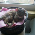 Chrissie gehört ebenso wie YinYang zu den ältesten der Gruppe. Sie ist sehr menschenscheu. Es dauert ein paar Wochen, bis sie Zutrauen fasst, sie versteckt sich anfangs viel, futtert dabei aber immer und bewegt sich auch, wenn man nicht da ist. Sie kennt menschliche Ansprache nur wenig, sie ist wegen mangelender Fürsorge menschlicherseits als Baby unter ferner liefen aufgewachsen, wie uns berichtet wurde, und hat versucht, durchzukommen. Sie ist sehr sehr defensiv anderen Katzen gegenüber und sucht immer die Nähe von YinYang, möglicherweise die Mutter oder Schwester. Es wäre daher schön, wenn sie mit YinYang umziehen dürfte, ggf. aber auch allein zu einem oder mehreren ganz lieben Artgenossen hinzu, die ihr nichts tun. Chrissie hat eine chronische Bronchitis, aufgrund vieler Erkältungen als Baby und in den ersten Lebensjahren. Sie hat ja nie genug zu fressen gefunden und wurde auch nie behandelt :-( Daher hört man Atemgeräusche, sie pfeift beim Atmen. Daran ist leider nichts mehr zu änderen, das wird so bleiben, wir haben geröntgt und Blut abgenommen, aber da ist alles o.k. bzw. das Röntgenbild zeigt die zerstörten Bronchienbereiche. Wenn sie jahreszeitlich bedingt oder durch Stress mal lauter atmet und mehr Probleme hat, dann bekommt sie eine Depot-Cortison-Spritze und alles ist wieder gut. Das war aber bisher nur einmal am Anfang notwendig. Wegen der Atemproblematik haben wir Chrissie nicht in Narkose gelegt und sie nicht mehr kastrieren lassen. Sie hatte sowieso schon keinen einzigen Zahn mehr im Mäulchen und ist beim Tierarzt ganz brav, so dass eine Sedierung auch nicht nötig war. Sie wird altersbedingt nicht mehr rollig. Im Gegensatz zu YinYang ist Chrissie komplett stubenrein und ansonsten völlig unauffällig und problemlos in der Haltung. Sie ist sehr ruhig und döst gern vor sich hin. Wir würden uns sehr für sie freuen, wenn jemand sie in ihr Herz ließe, denn die volle Pflegestelle ist langfristig keine Alternative für sie. Bisher haben wir nur ein Foto, sie war ja so lange scheu. Die Zeiten sind allerdings vorbei, so dass wir in Bälde mehr und aktuelle Fotos einstellen können.